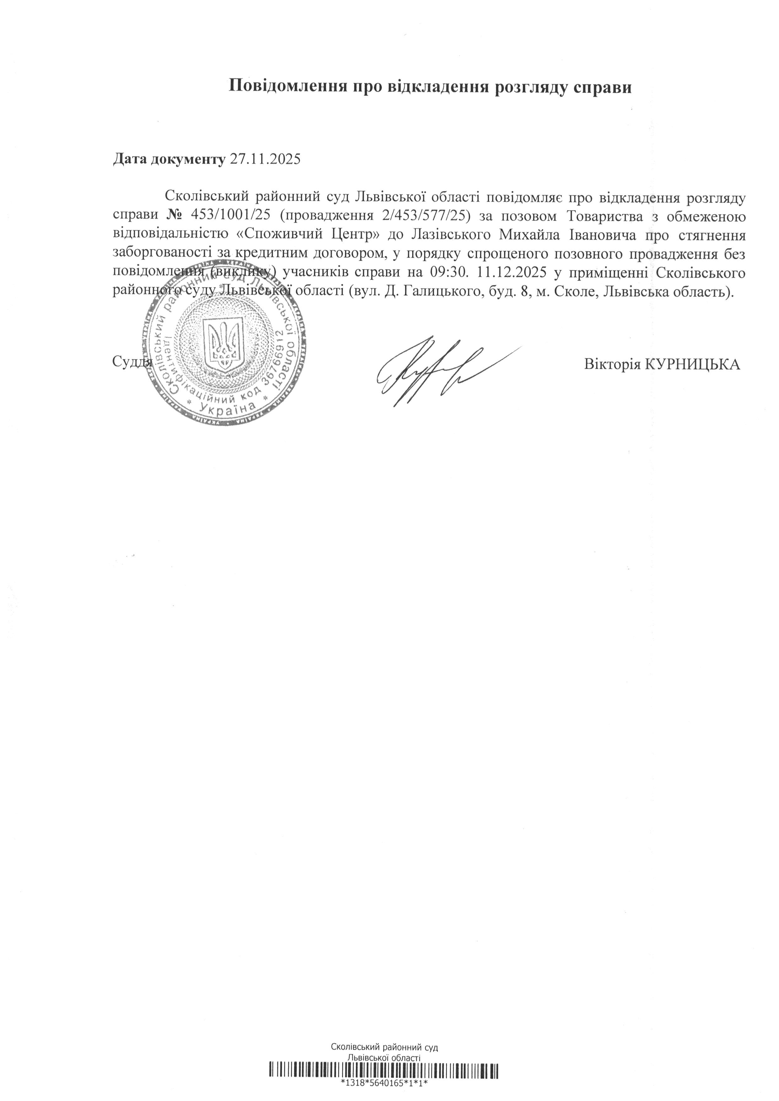 Повідомлення про відкладення розгляду справи