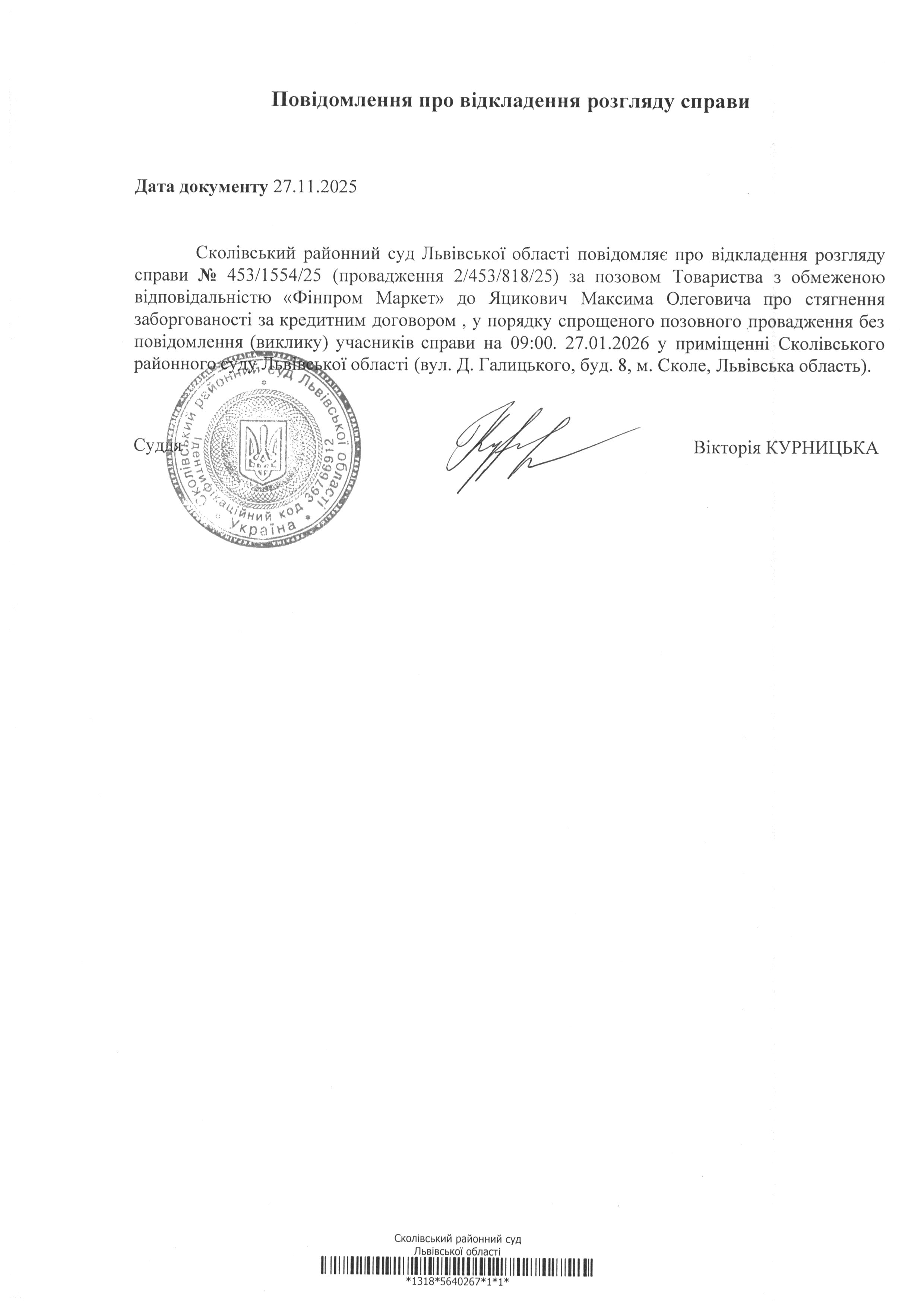 Повідомлення про відкладення розгляду справи
