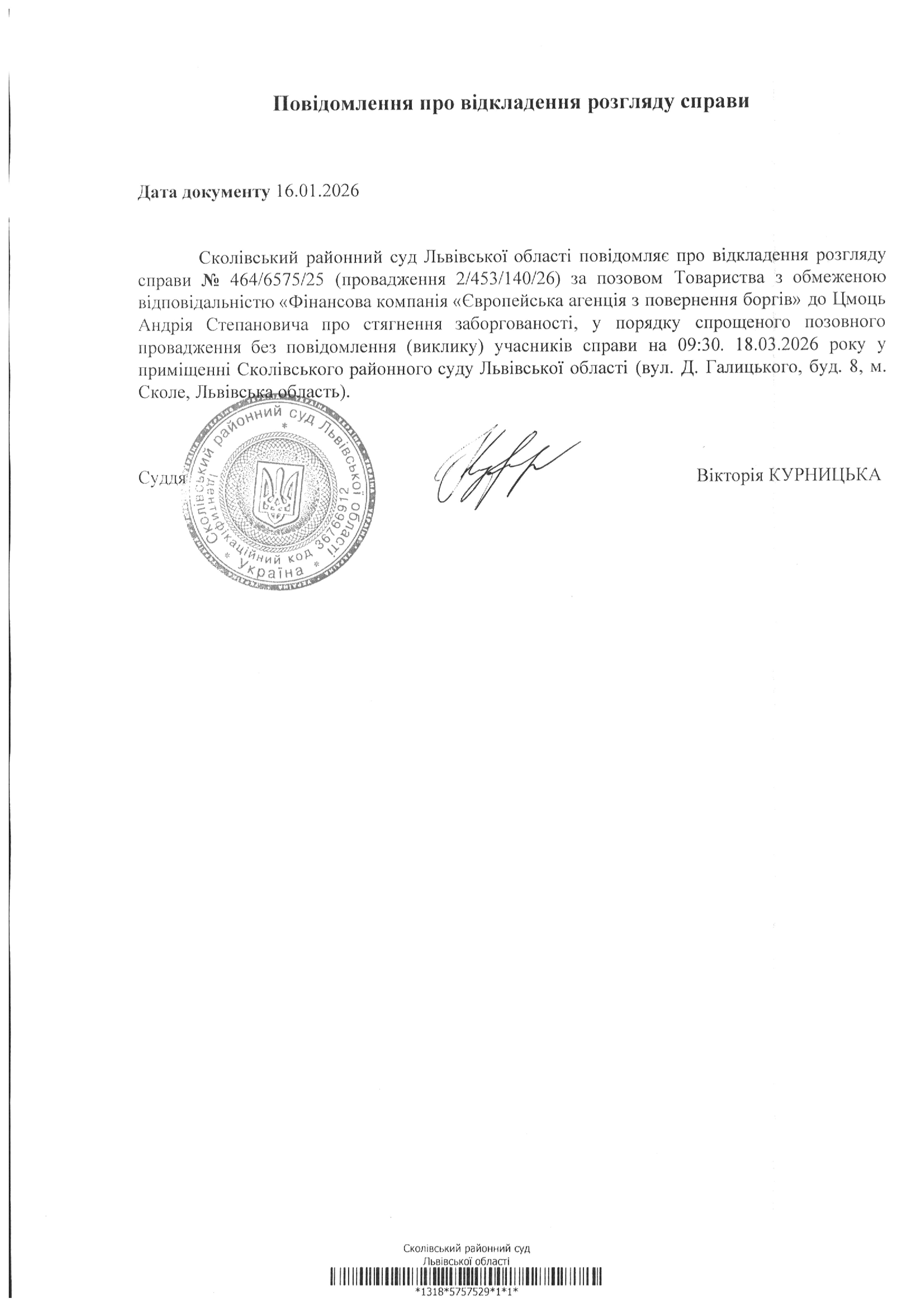 Повідомлення про відкладення розгляду справи