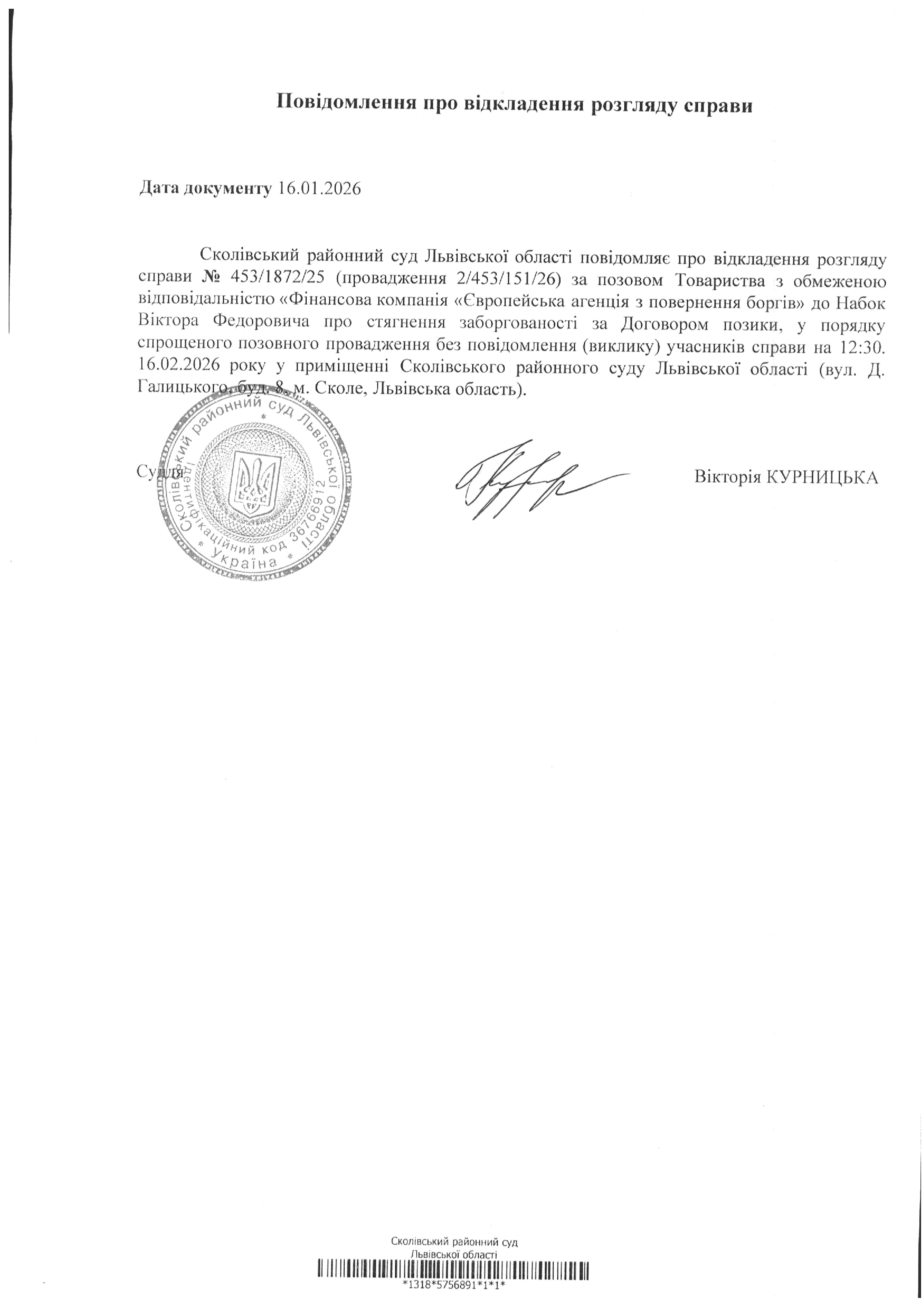 Повідомлення про відкладення розгляду справи