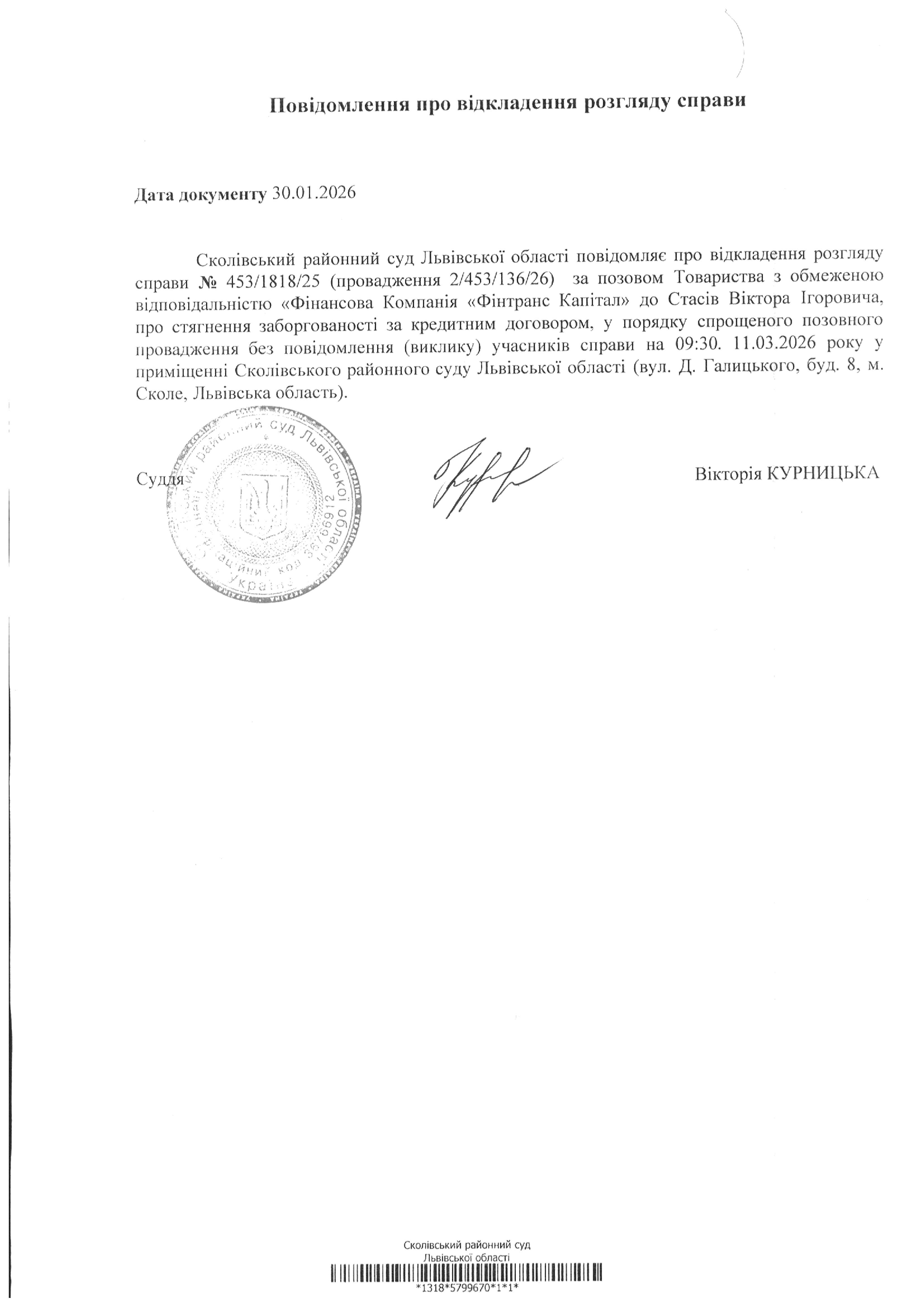 Повідомлення про відкладення розгляду справи
