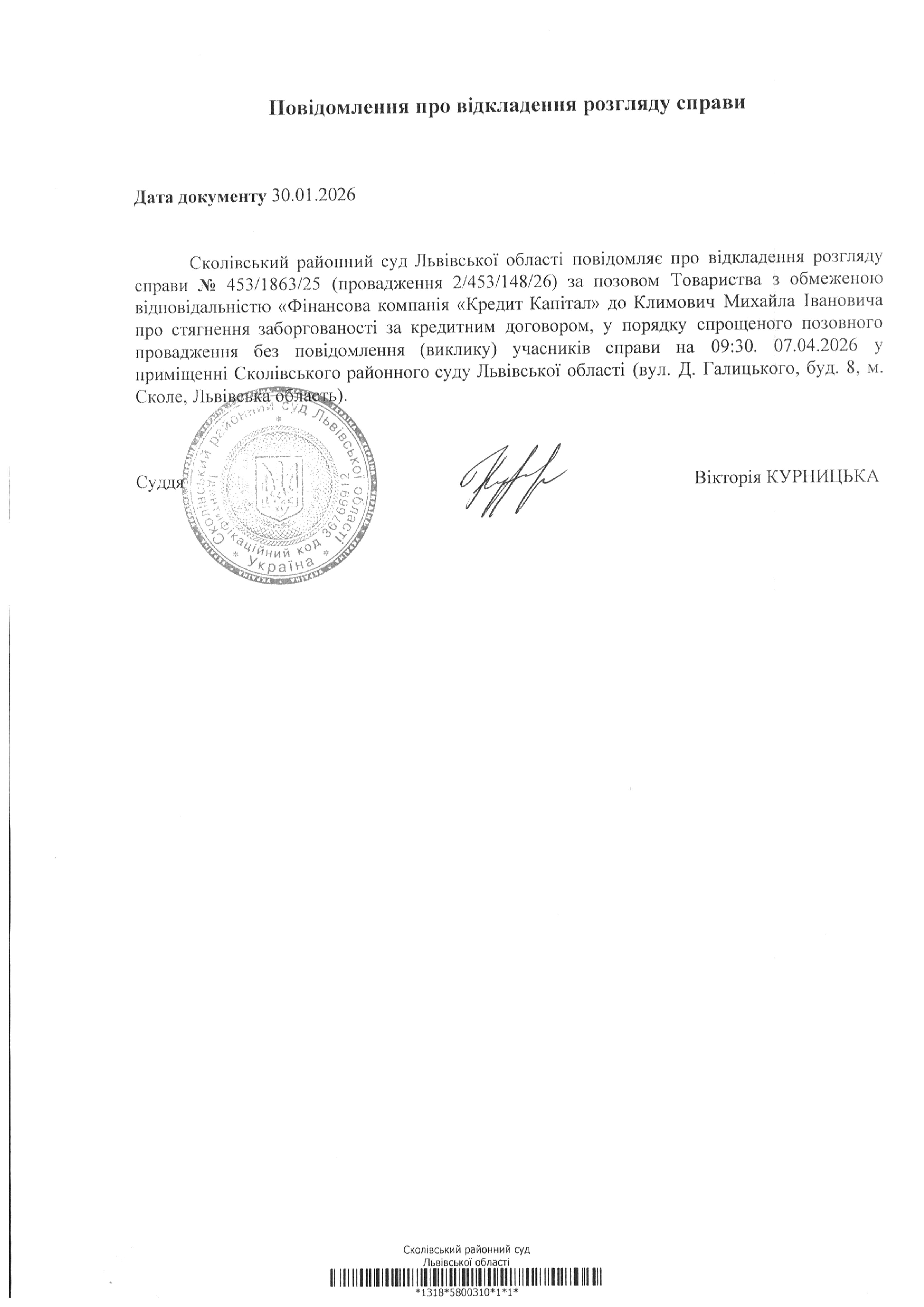 Повідомлення про відкладення розгляду справи