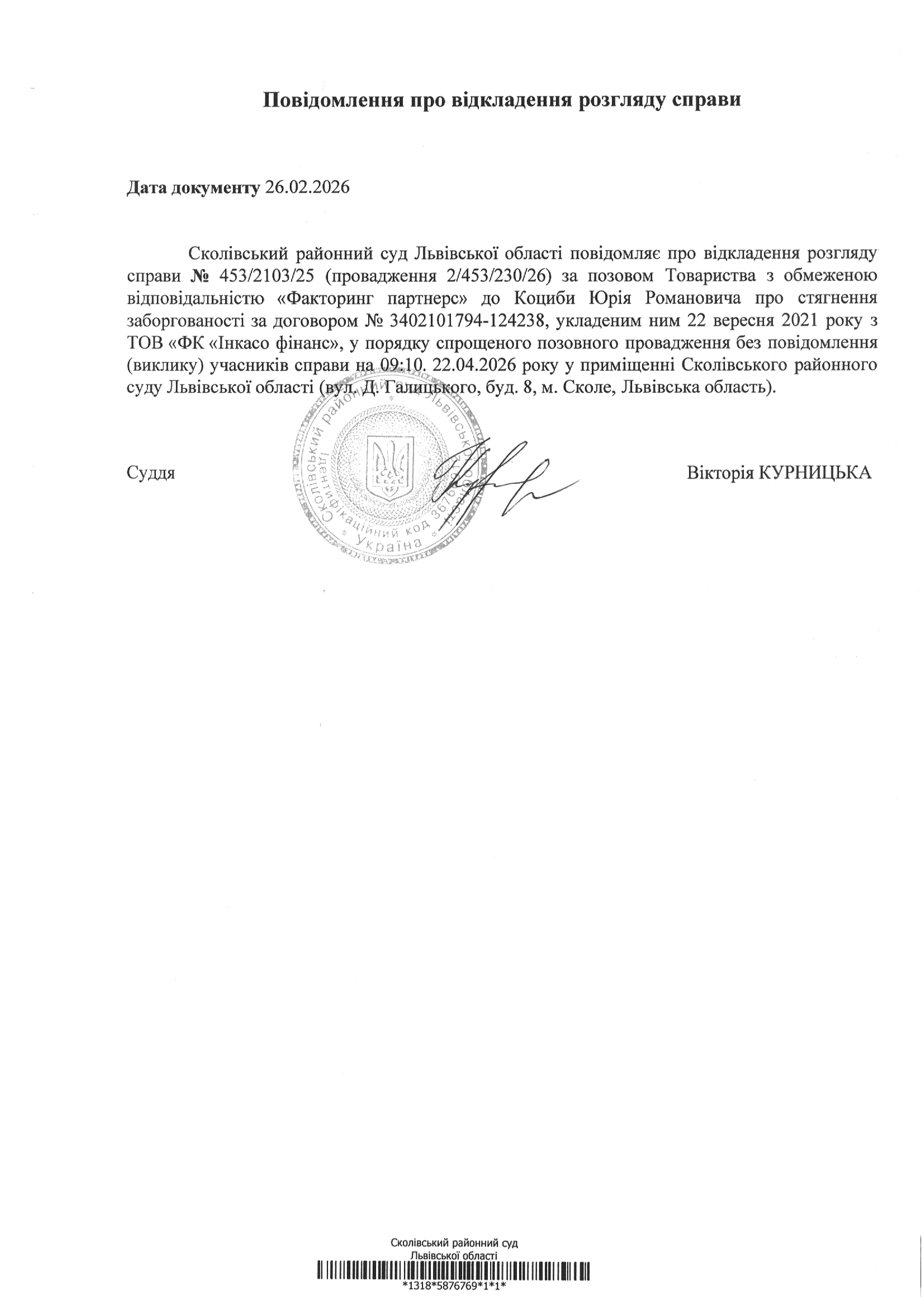Повідомлення про відкладення розгляду справи