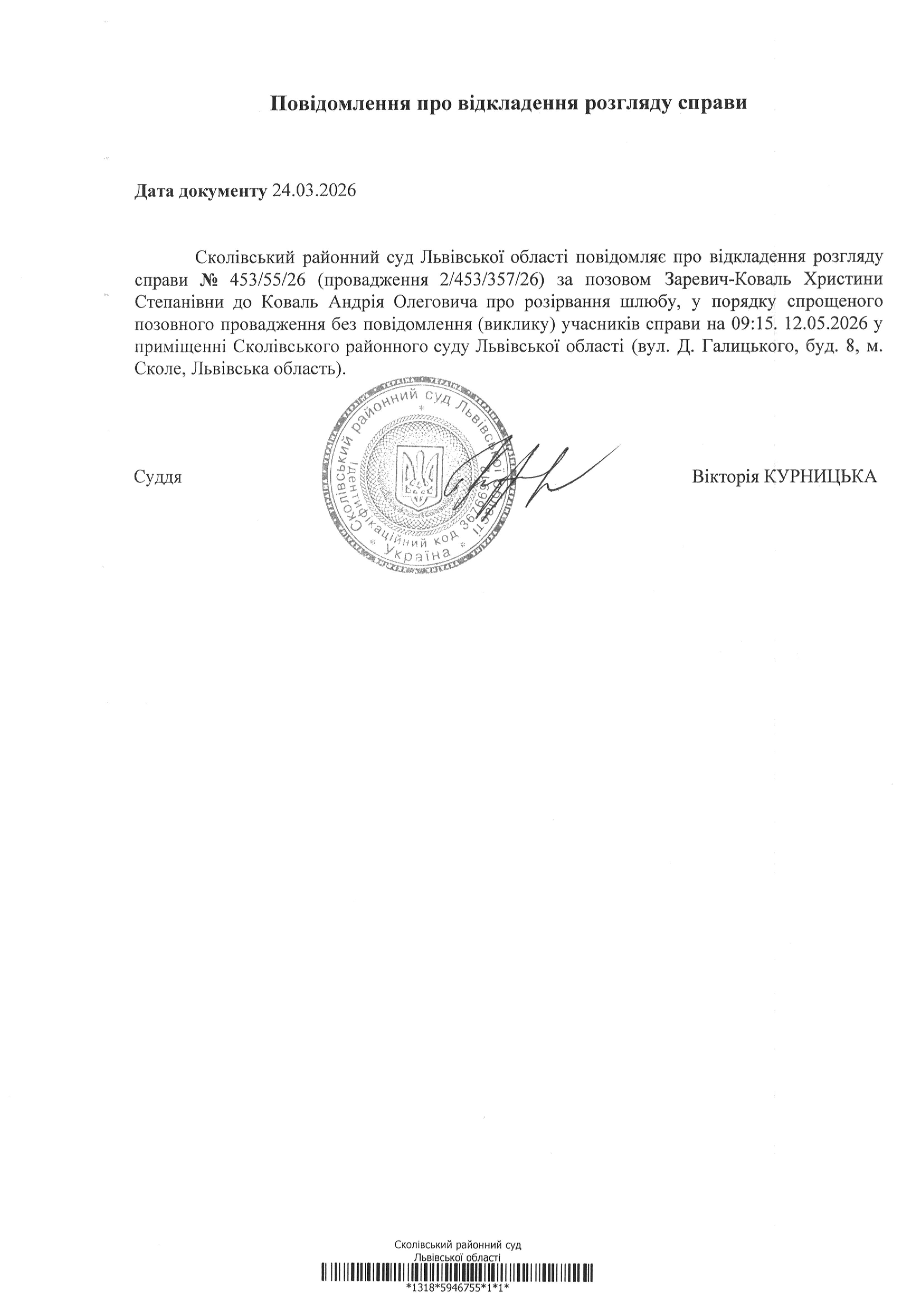 Повідомлення про відкладення розгляду справи